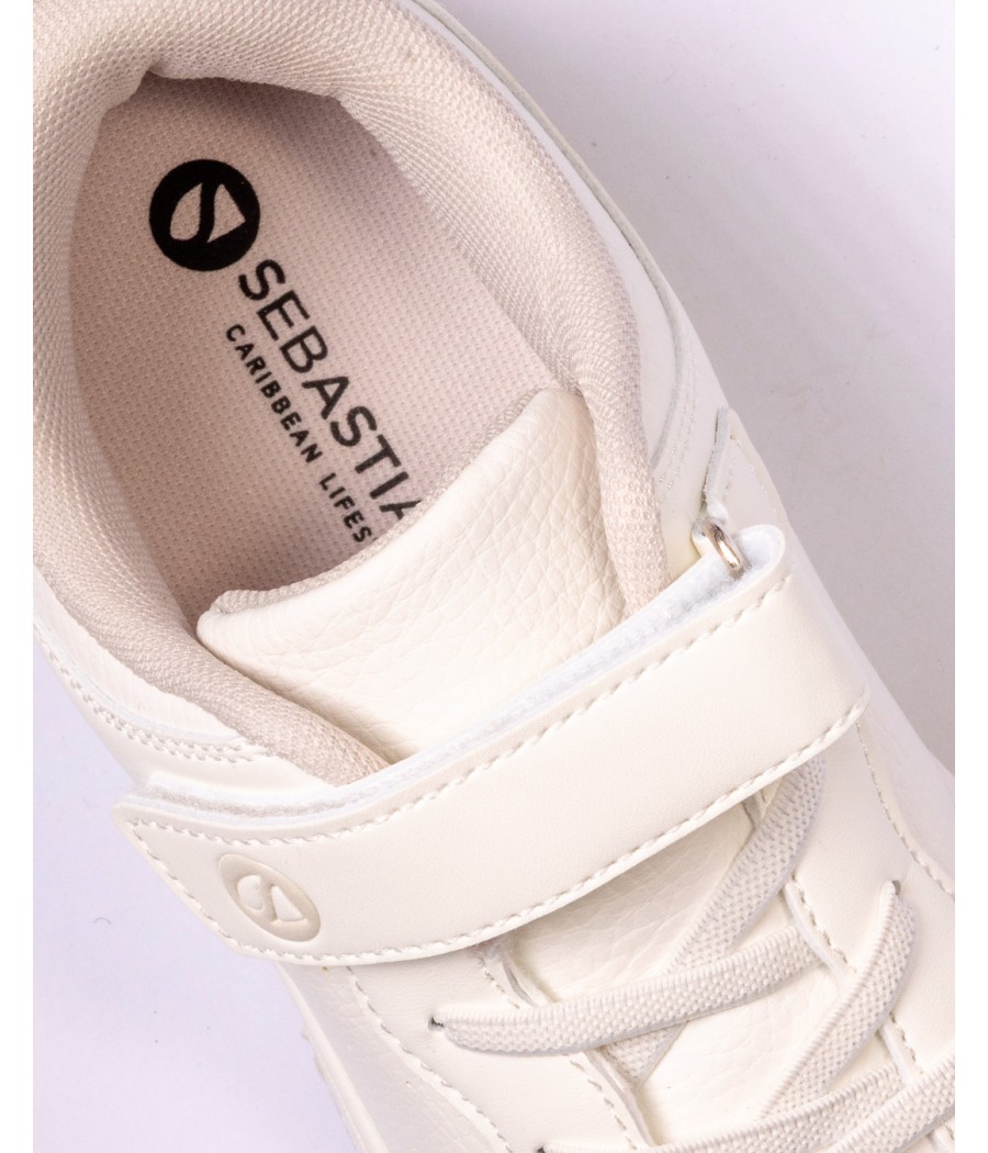 La tige en PU à effet grainé et lisse apporte résistance et facilité d’entretien, tandis que l’intérieur en mesh respirant assure un confort optimal tout au long de la journée. Les lacets élastiques combinés à une fermeture scratch sur le dessus, ornée du logo Sebastiano, permettent un enfilage rapide et favorisent l’autonomie.